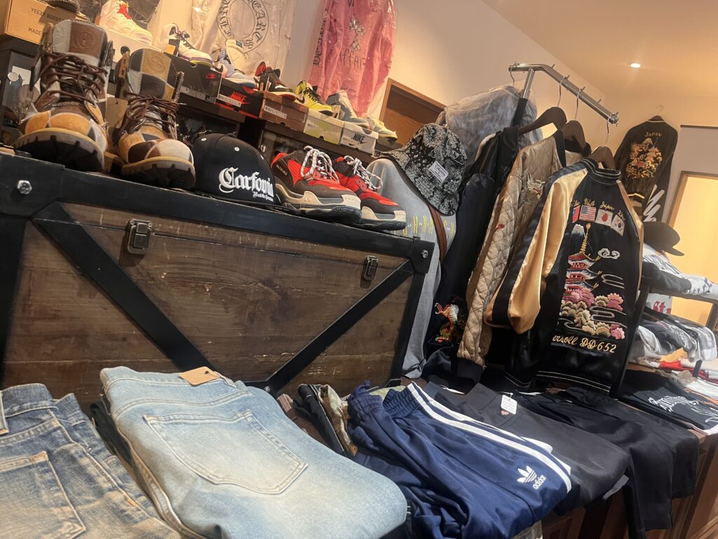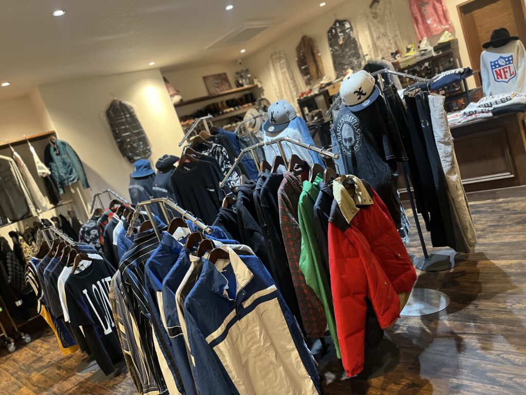 当店の雰囲気を少しご紹介します🎶 店内には、 アウター・ジャケット・スウェット・シャツ・パンツなど 年代やジャンルにとらわれず、さまざまな古着を並べています💓 無骨な雰囲気のアイテムから、 少しクセのあるデザインまで😊👌