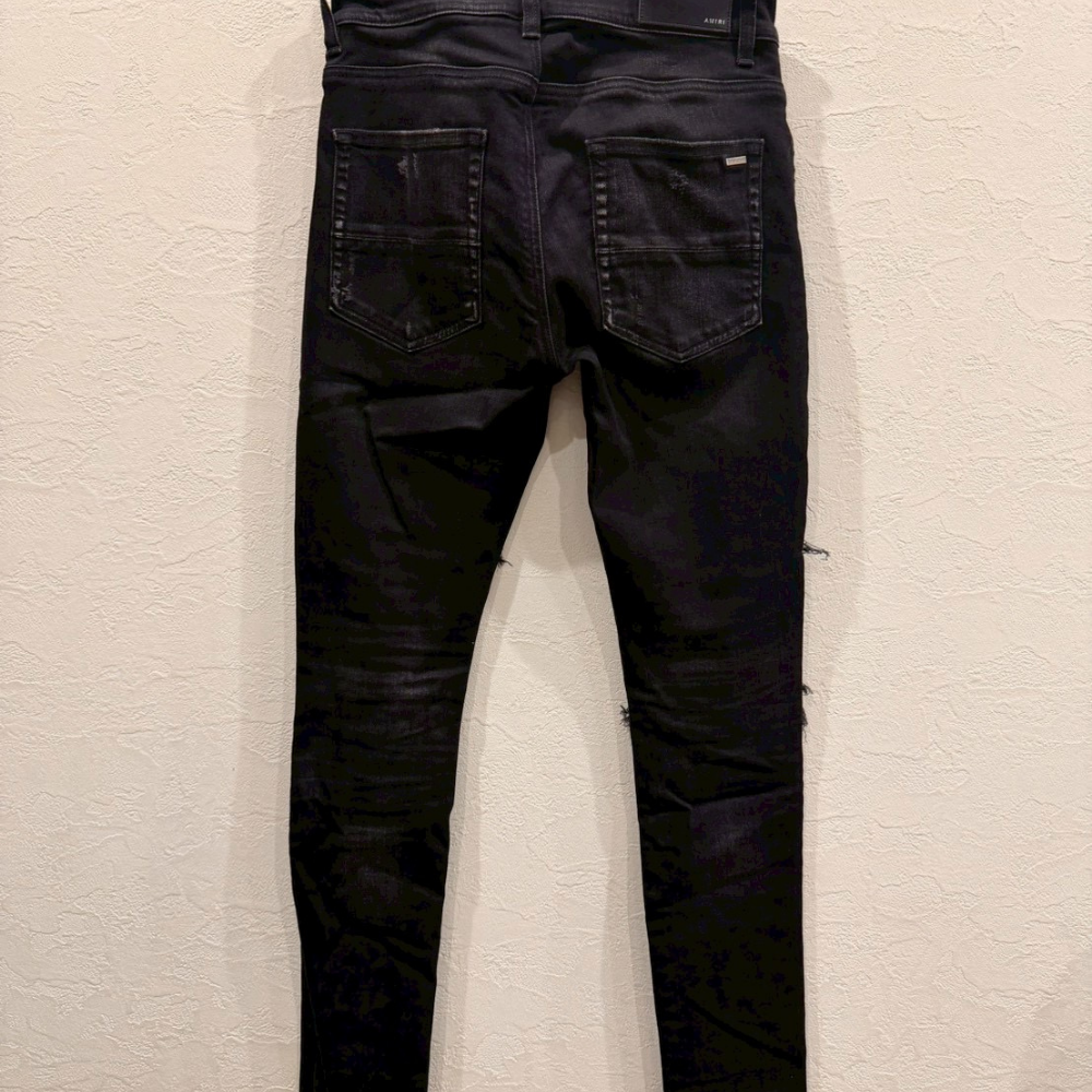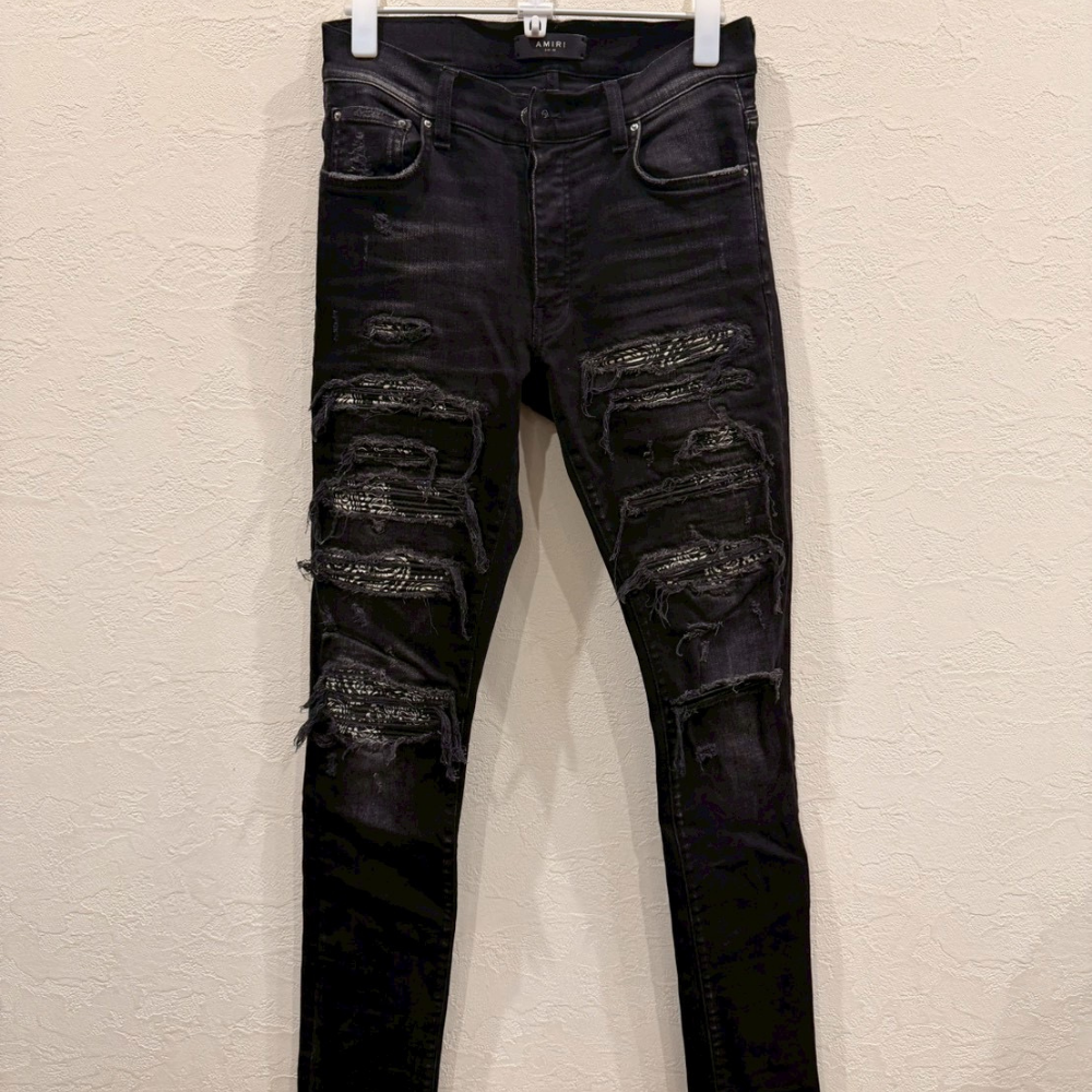 AMIRIの代表作 MX1 デニム。レザーパッチと大胆なクラッシュが特徴で、脚を細く見せるスキニーシルエットの人気モデル。