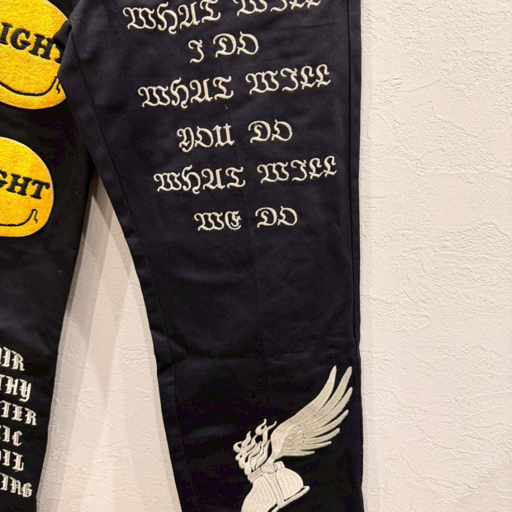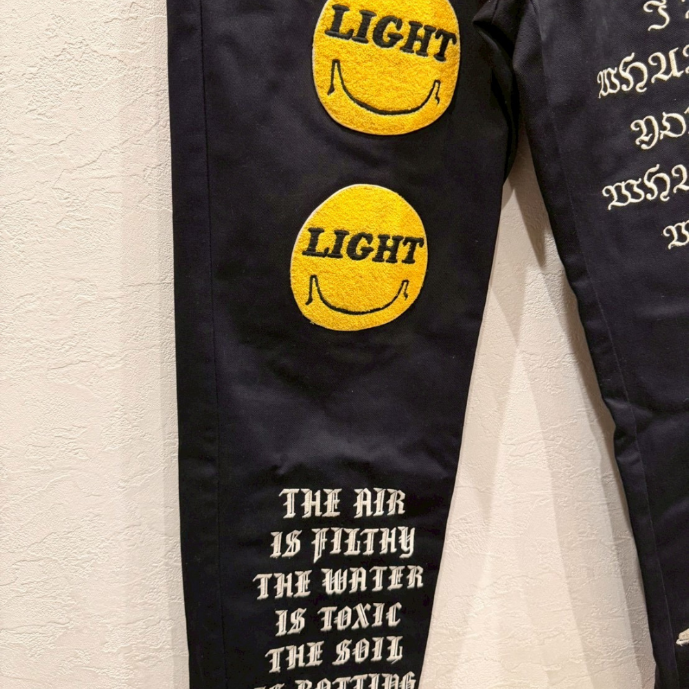 ブラックのワークパンツをベースに、フロント〜サイドにかけて大胆なプリントを施した一本です。スマイルマークや英字グラフィックが印象的で、ストリート色の強いデザインが特徴。ワークパンツ特有の適度なハリ感があり、シルエットをきれいに見せてくれます。
