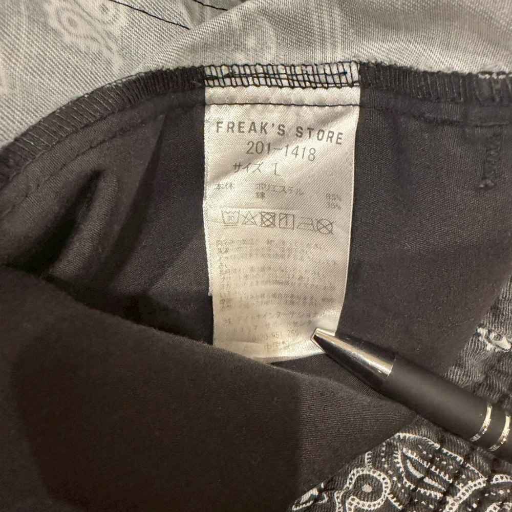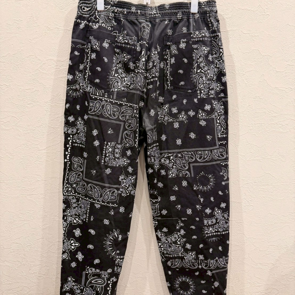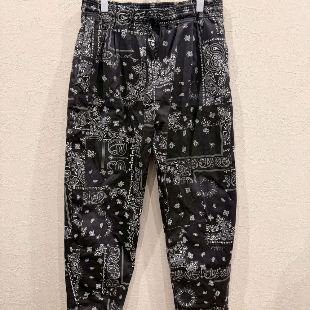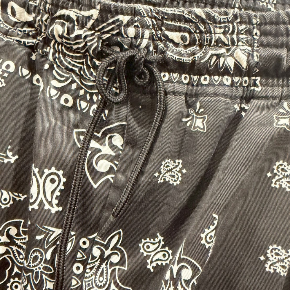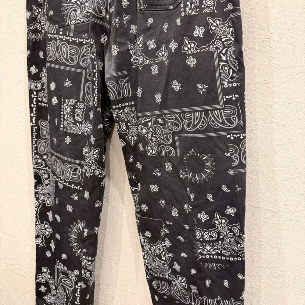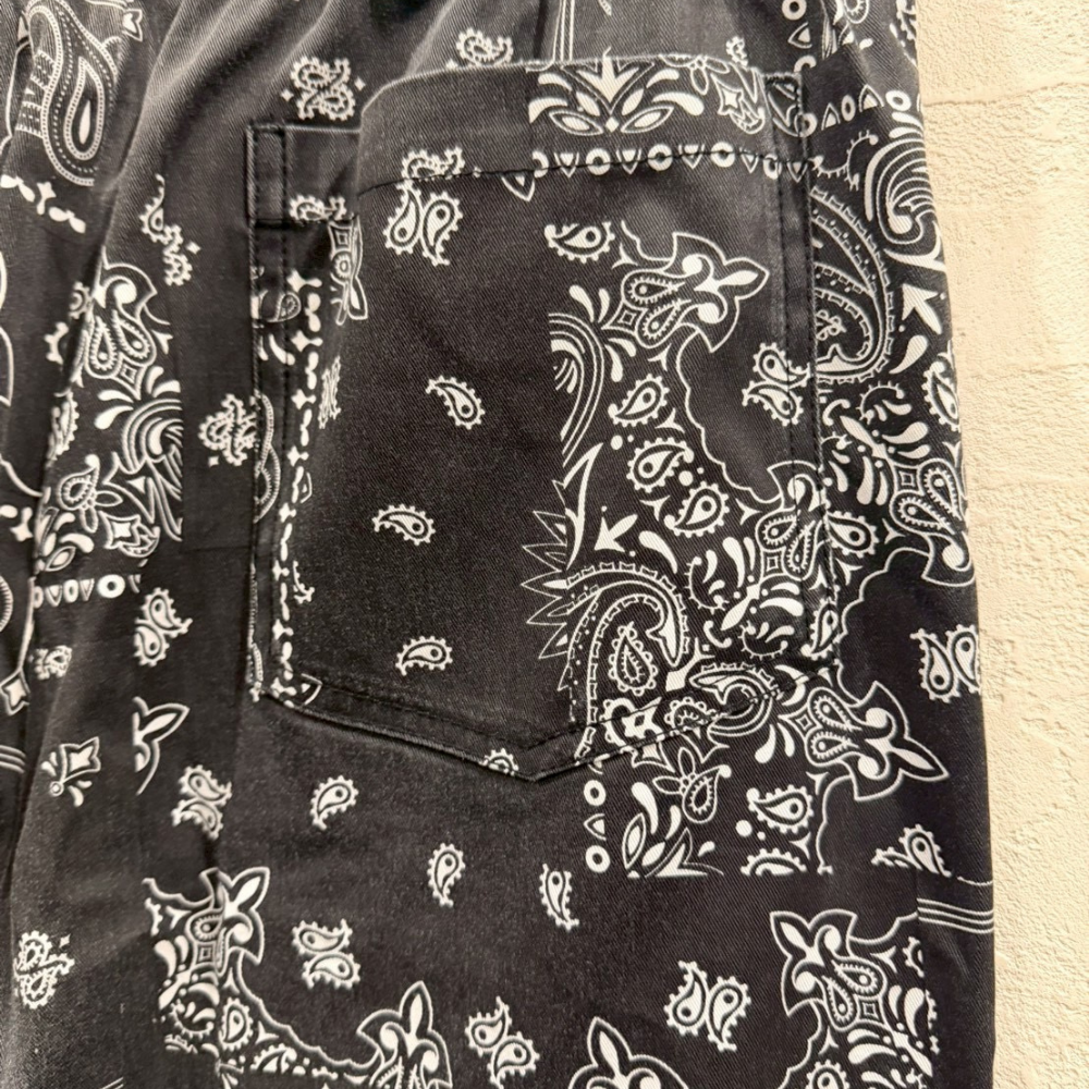 FREAK’S STORE(フリークスストア)の人気アイテム、バンダナ柄イージーパンツ。ブラックをベースにホワイトのバンダナパターンを全面にプリントした存在感抜群の一本です。軽量でさらりとした生地感で、リラックスした履き心地ながらスタイルの主役としてしっかり活躍します。