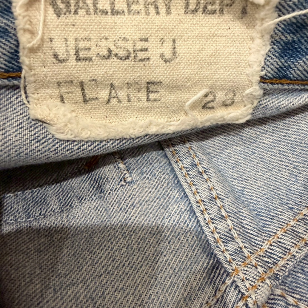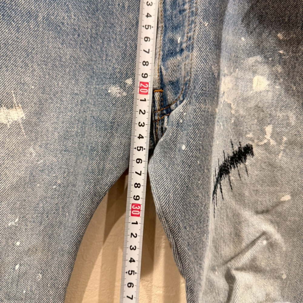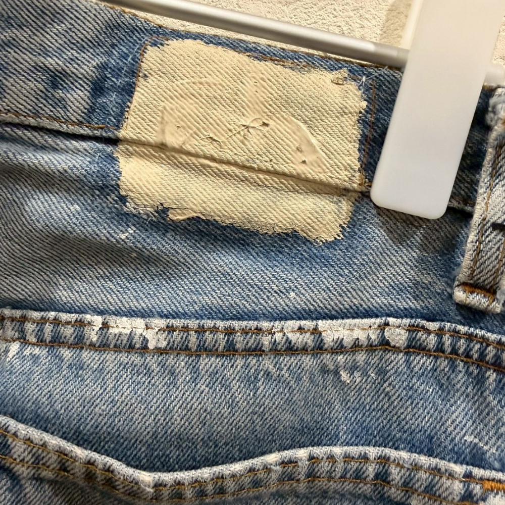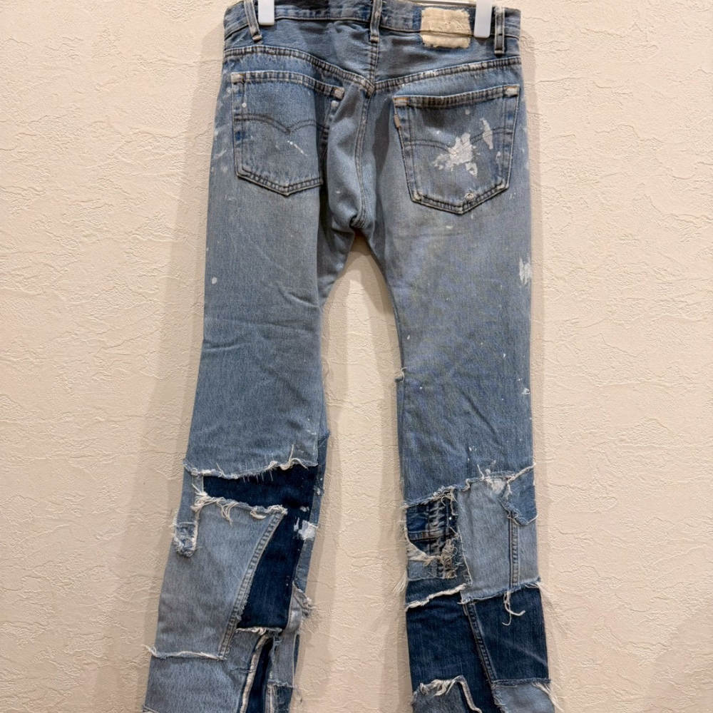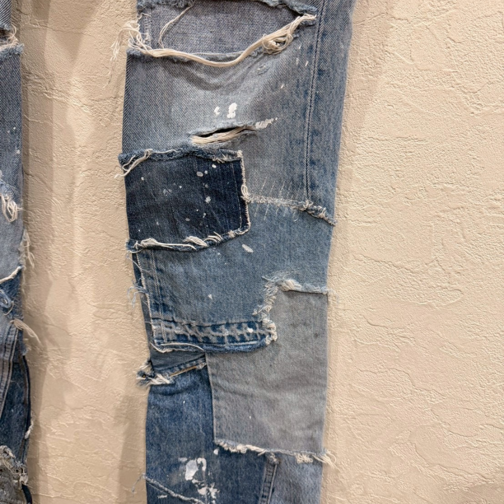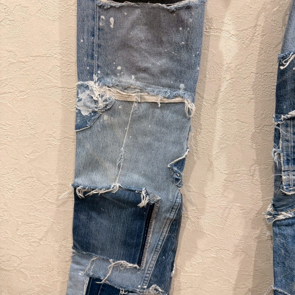 GALLERY DEPT.の中でも特に希少性の高い「JESSE J FLAIR」リメイクデニム。ブランドの象徴でもある大胆なクラッシュダメージに加え、多数のパッチワークで再構築された手作業仕上げの一本です。さらにホワイトペンキ加工が全面に施されており、アートピースのような存在感を放ちます。