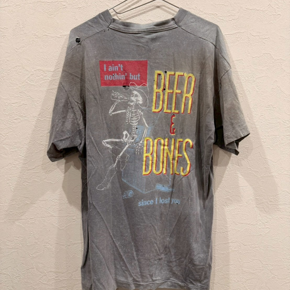 JOHN MICHAELらしいユニークなグラフィックが印象的なヴィンテージTシャツ。フロントのロゴに加え、バックの「BEER & BONES」プリントとスケルトンモチーフが目を引くデザインで、シンプルなパンツに合わせるだけでも雰囲気のあるスタイルに仕上がります。全体に施された色褪せ・掠れ加工は古着ならではの魅力で、長く着込まれたようなリアルな風合いを楽しめる1枚です。