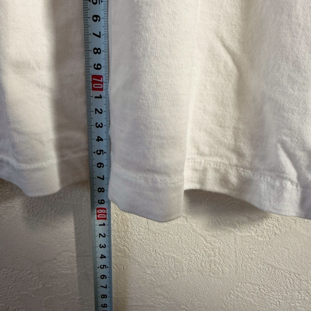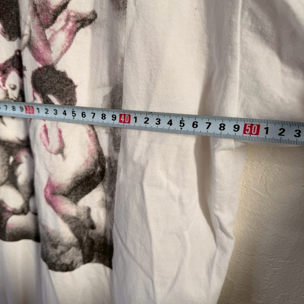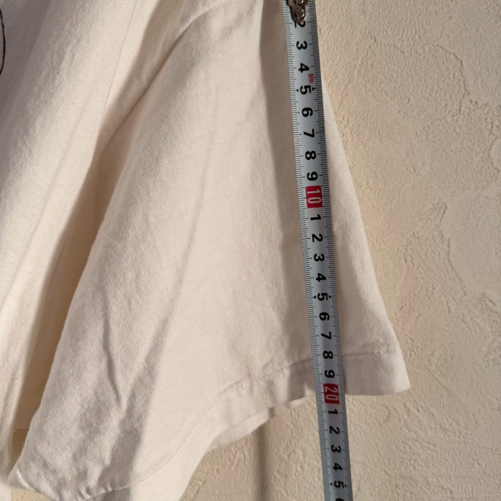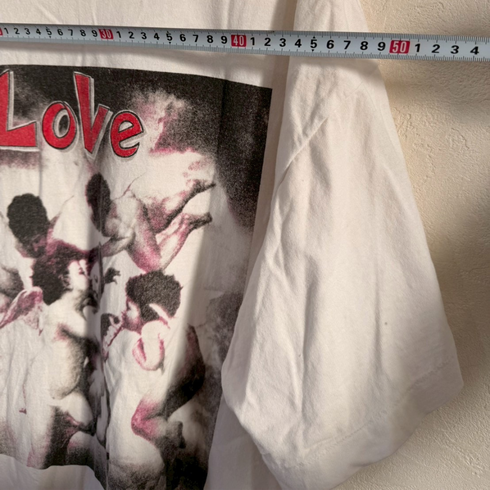 Loveロゴとフォトグラフィックを大胆に組み合わせたアート性の高いプリントTシャツ。写真をベースにしたモノトーンデザインと赤いロゴのコントラストが目を引き、1枚でスタイリングの主役になるアイテムです。ややゆったりとしたサイズ感で、古着らしい自然な使用感が馴染みやすく、デイリーで着用しやすい仕上がりになっています。袖や裾に軽いシワや着用感は見られますが、目立つダメージはなく、プリントの色残りも良い状態です。ストリートファッションやフォトプリントTシャツが好きな方、アート系デザインを求める方におすすめの1着です。
