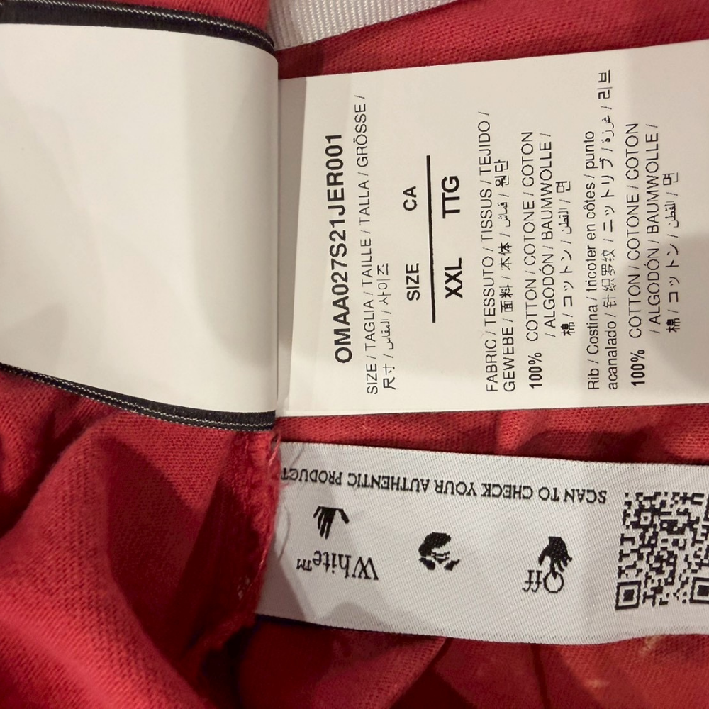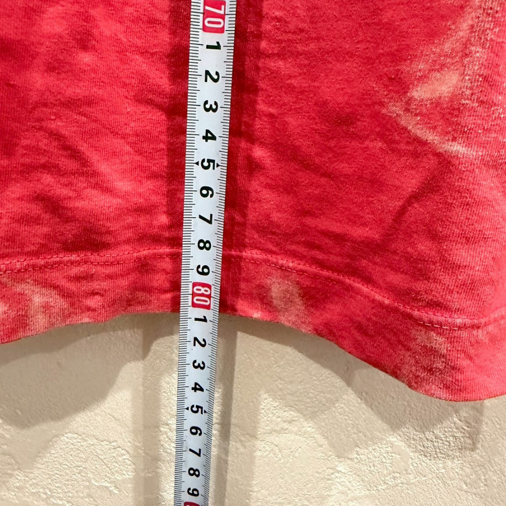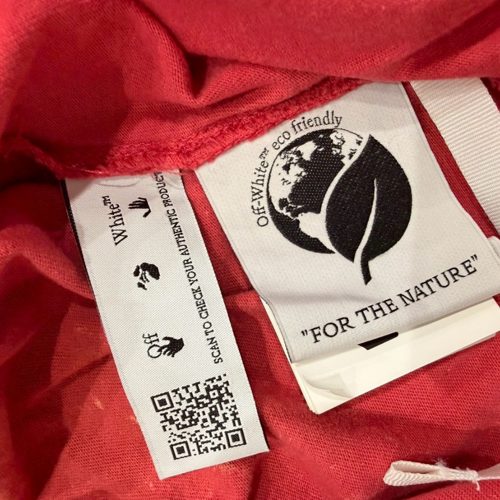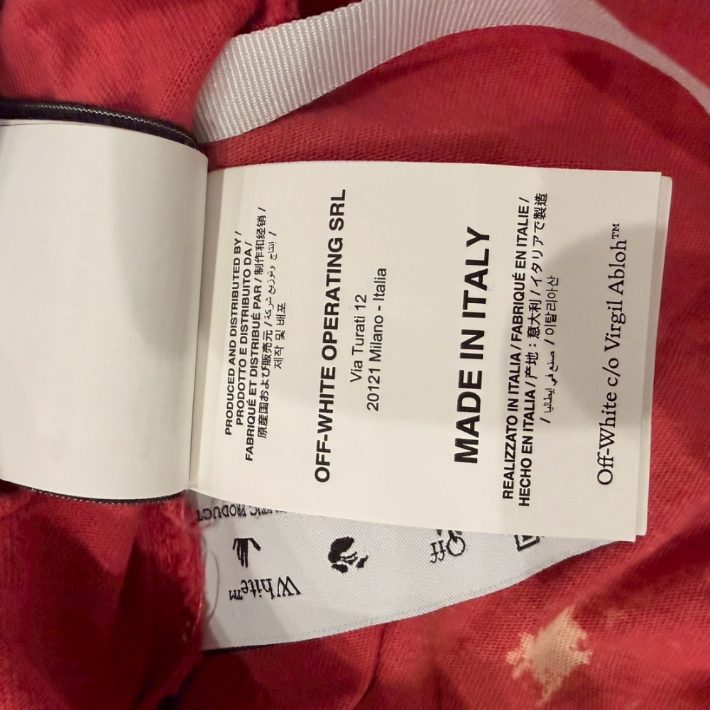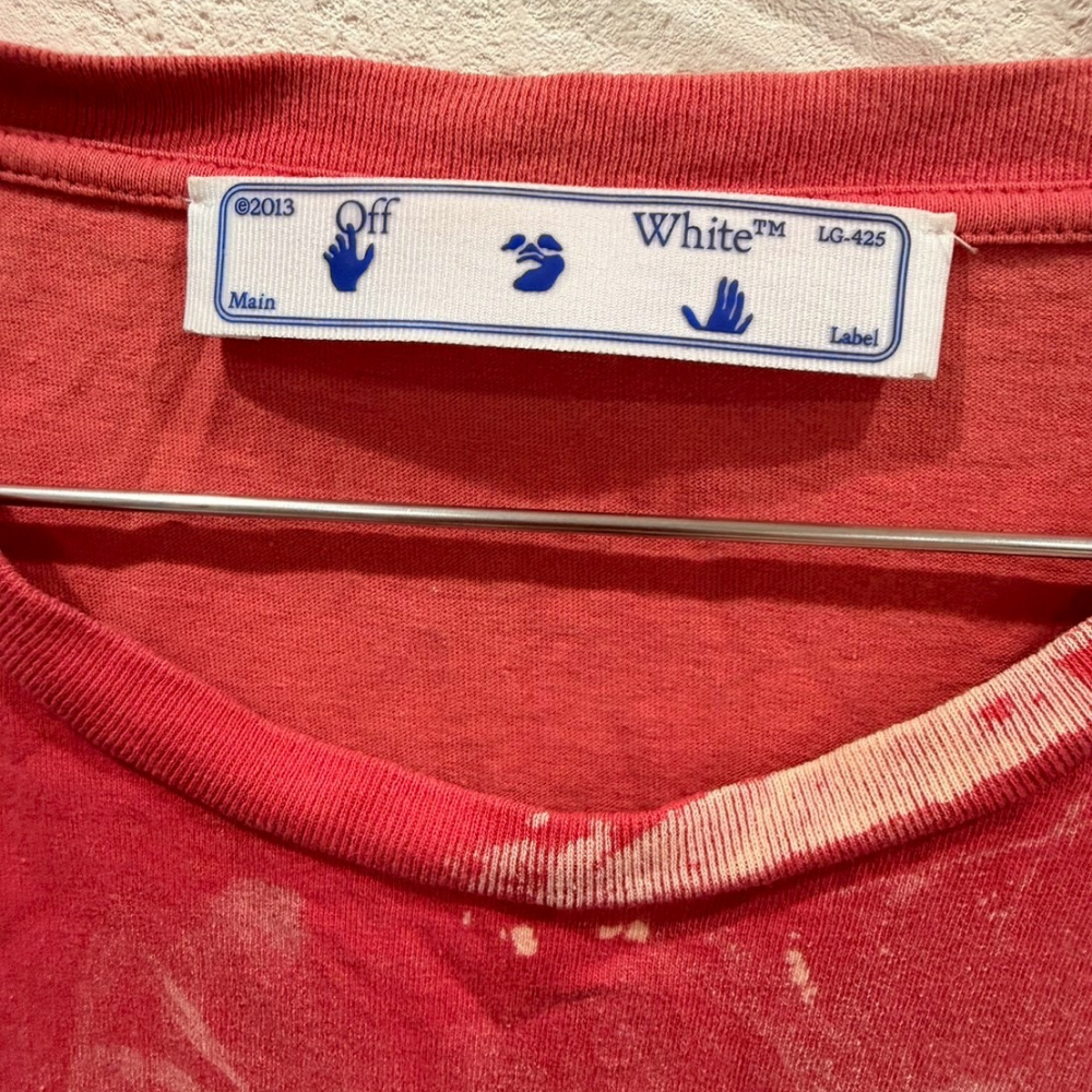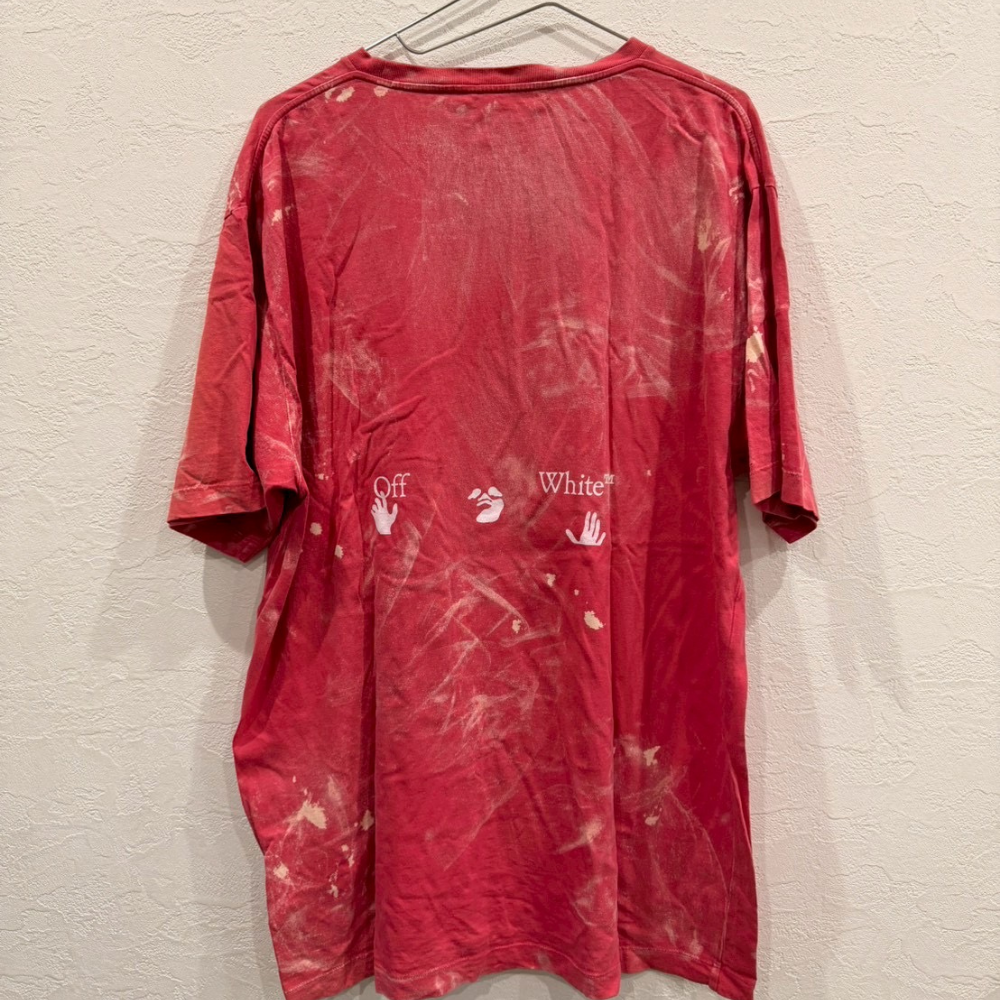 赤地にホワイトのペイント加工が施されたOFF-WHITEのデザインTシャツ。ユーズドならではの風合いと大胆なアート性が魅力の一枚です。