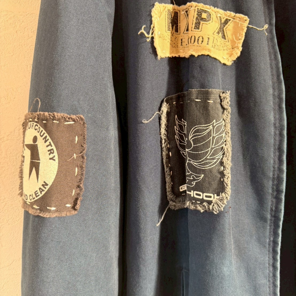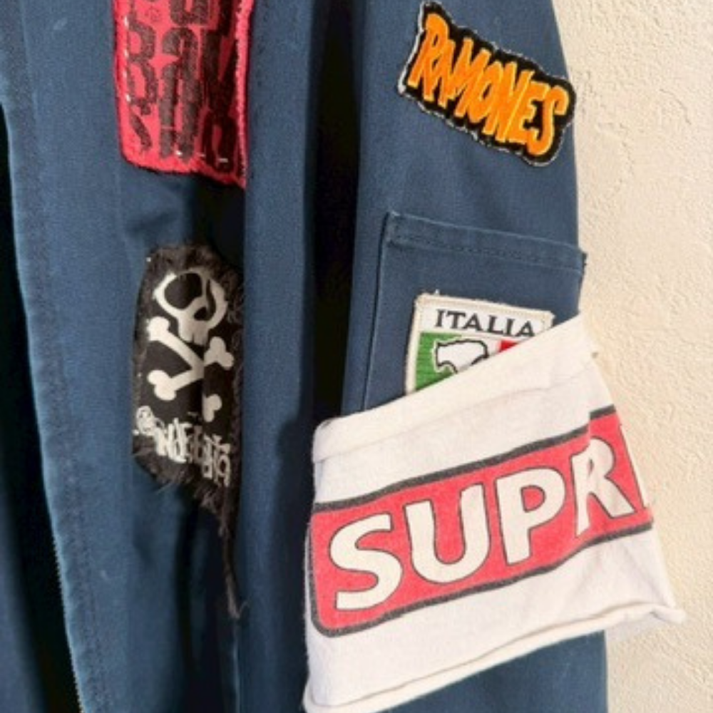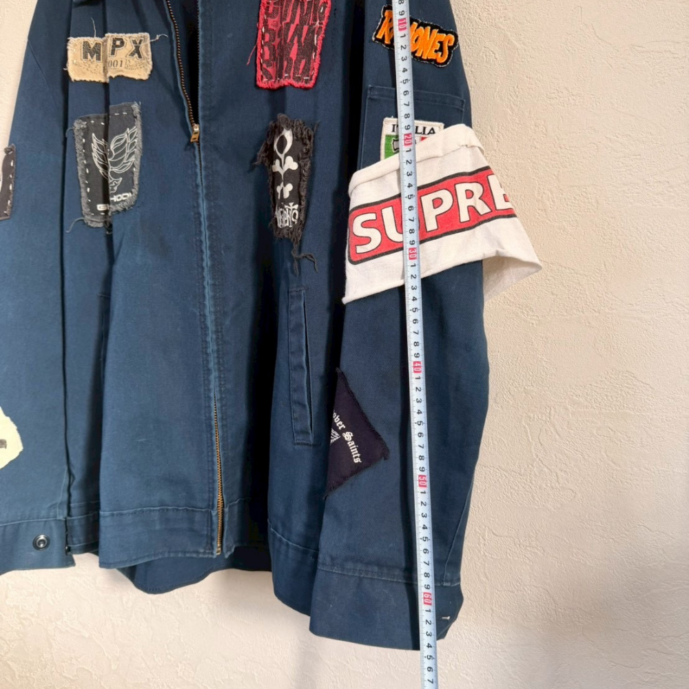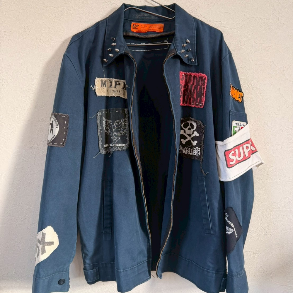 個性的なスタイリングを求める方にぴったりの、パッチワークカスタムジャケットです。ベースはブルー系のワークジャケットで、フロント・袖・背面まで多数のワッペンを大胆に配置し、アートピースのような存在感を放つ一着に仕上がっています。SUPREME風ロゴやスカル・ファッションブランド調のパッチなど、アンバランスな組み合わせが逆に魅力を引き立てています。ゆったりとしたシルエットのため重ね着もしやすく、ストリートコーデはもちろん、ワンポイントで個性を出したいシンプルコーデにも相性抜群。古着特有の使用感はありますが、機能的なダメージはなく普段使いにも問題ありません。パッチが多く施された一点物のジャケットを探している方や、DIYカスタムアイテムが好きな方に特におすすめのアウターです。