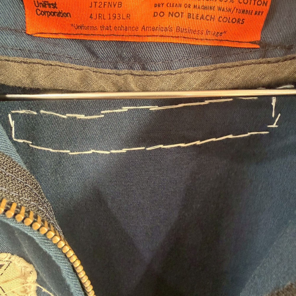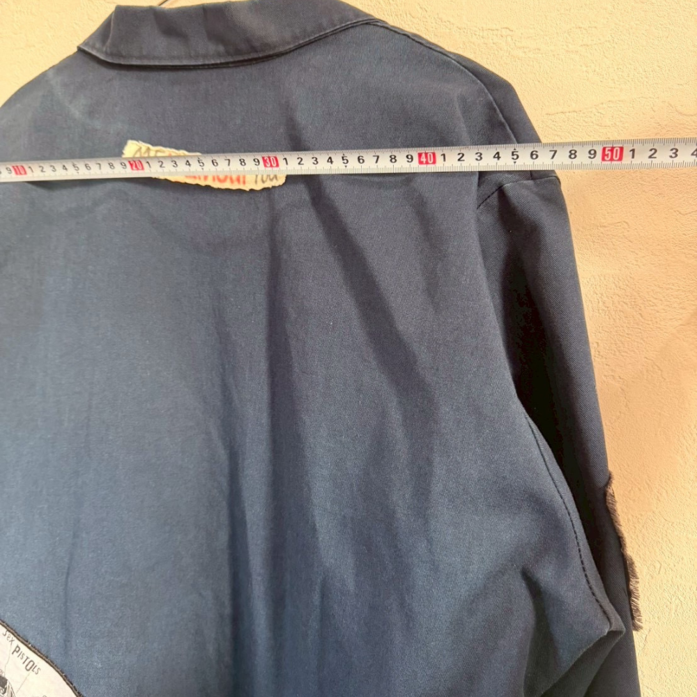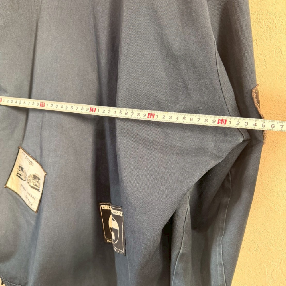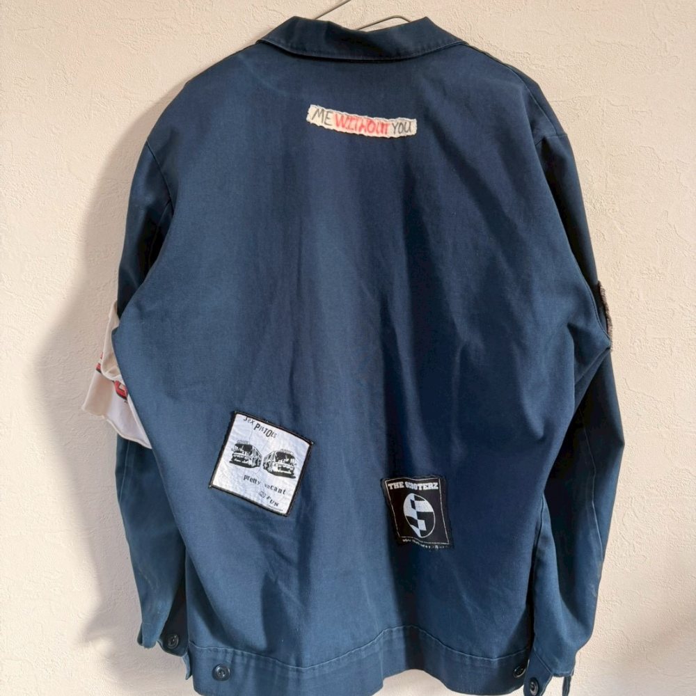個性的なスタイリングを求める方にぴったりの、パッチワークカスタムジャケットです。ベースはブルー系のワークジャケットで、フロント・袖・背面まで多数のワッペンを大胆に配置し、アートピースのような存在感を放つ一着に仕上がっています。SUPREME風ロゴやスカル・ファッションブランド調のパッチなど、アンバランスな組み合わせが逆に魅力を引き立てています。ゆったりとしたシルエットのため重ね着もしやすく、ストリートコーデはもちろん、ワンポイントで個性を出したいシンプルコーデにも相性抜群。古着特有の使用感はありますが、機能的なダメージはなく普段使いにも問題ありません。パッチが多く施された一点物のジャケットを探している方や、DIYカスタムアイテムが好きな方に特におすすめのアウターです。